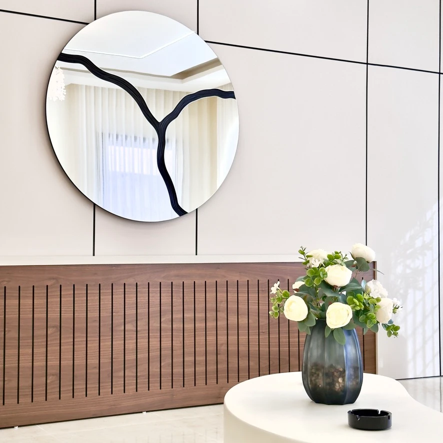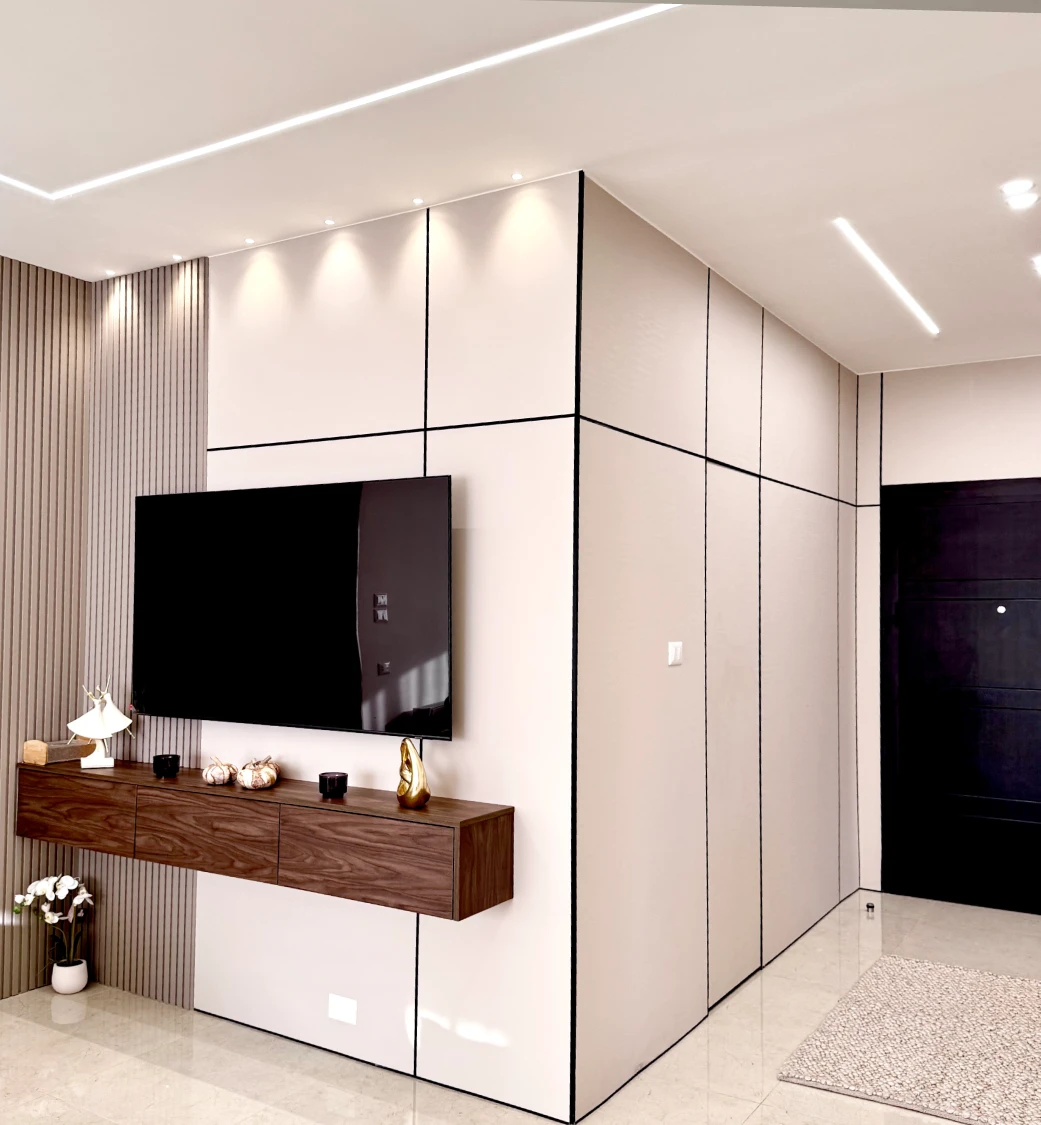 - واجهة التلفزيون: استبدلنا فكرة الموقد (الفايربليس) برف عصري أنيق مع خطوط إضاءة LED خفية، مما أعطى الواجهة لمسة راقية وخفيفة.