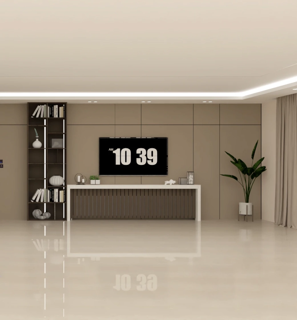 في صور التصميم الثلاثي الأبعاد، كان الصالون يطل بخطوط نظيفة وألوان متناغمة، والإضاءة تسلّط الضوء على تفاصيل الجدران. المدخل بدا أنيقًا وفسيحًا، وواجهة التلفزيون عصرية بلا تعقيد.