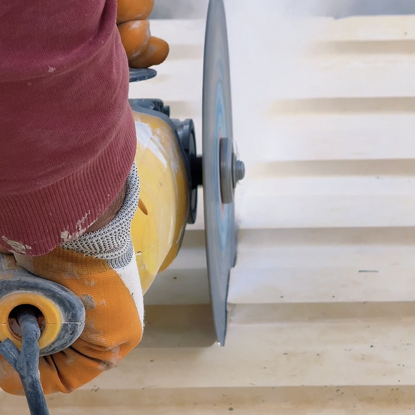 بعد أخذ المقاسات، يتم اختيار الحجر الذي يتناسب مع المشروع. يتم تحديد الحجر بناءً على المقاسات التي تم أخذها مسبقًا، حيث يتم وضع علامات على الحجر ليتم قصه بشكل يتناسب مع الأبعاد المحددة.